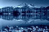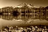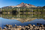 Volcanic mountain in morning light reflected in still waters of foreground lake