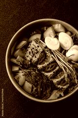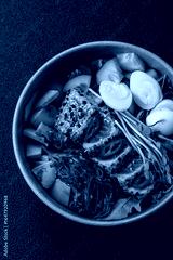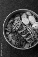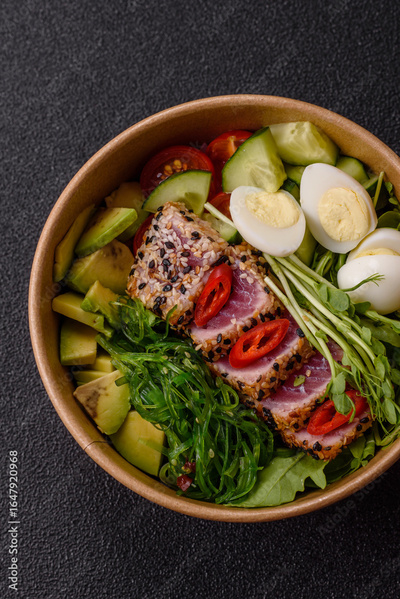 Seafood bowl, tuna tataki fillet slices with rice, oranges, tomatoes and sauce. Tuna bowl