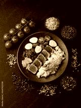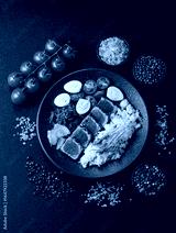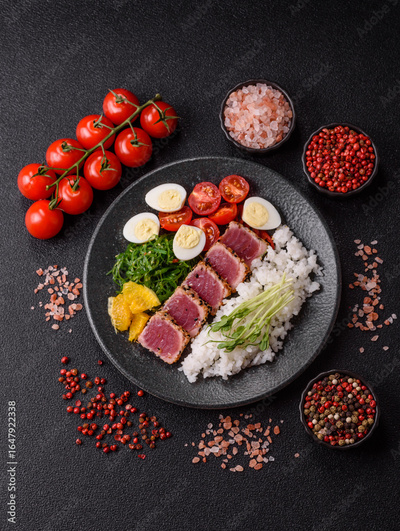 Seafood bowl, tuna tataki fillet slices with rice, oranges, tomatoes and sauce. Tuna bowl