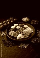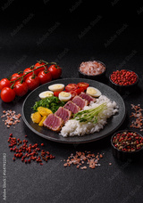 Seafood bowl, tuna tataki fillet slices with rice, oranges, tomatoes and sauce. Tuna bowl