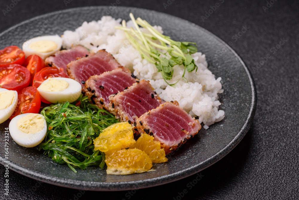 Seafood bowl, tuna tataki fillet slices with rice, oranges, tomatoes and sauce. Tuna bowl