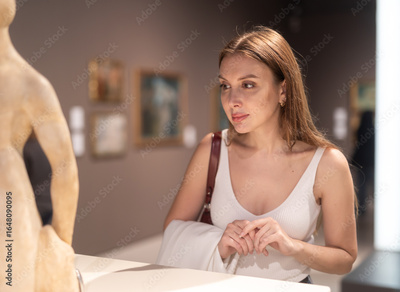 Woman studies a stone statue in a museum with interest. European woman looks at a sculpture in the exhibition hall