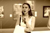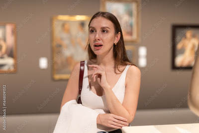 Girl walk along exhibition pavilion, get acquainted with pictures. Paintings, icons are placed on walls. She stopped stands in front of picture thoughtfully examines plot of painting