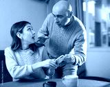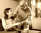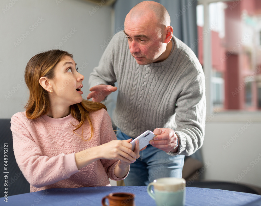 Emotional man swearing at young wife takes her mobile phone out of her hands