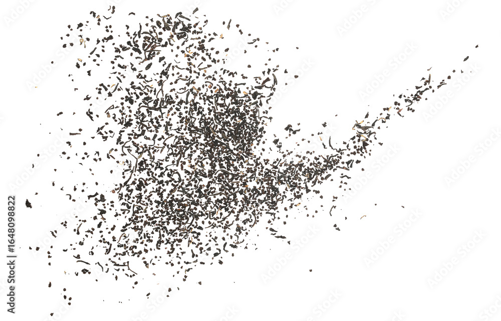 Black tea dry leaves flying, isolated on white background and texture, clipping path