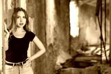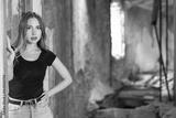 Positive young attractive woman with long brown hair in blue jeans and black tight-fitting t-shirt posing inside old ruined house..