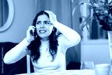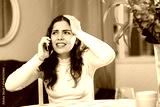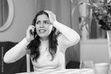 Stressed young woman sitting at table at home gesturing emotionally and talking on phone