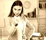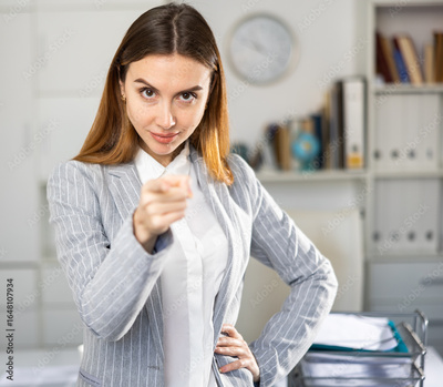 Successful business woman pointing her finger at you in the office