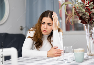 Depressed young woman sitting at table. Portrait of sad woman at home.