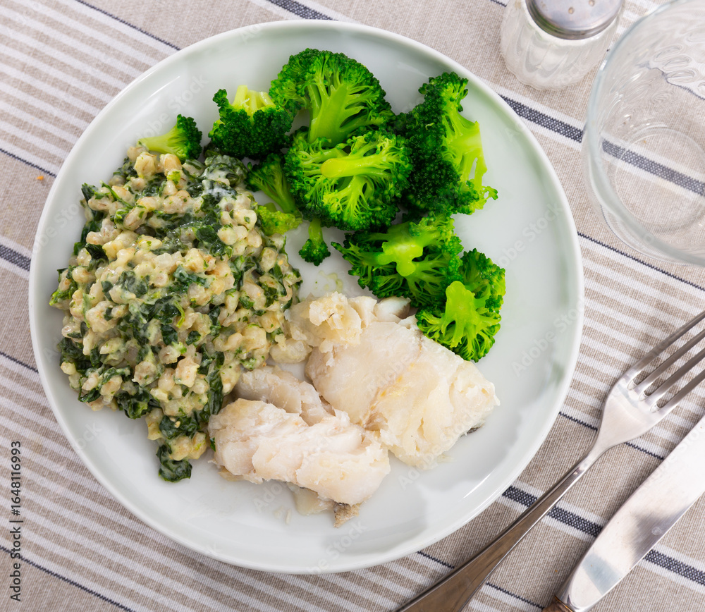 Delicious dish of cod fillet, pearl barley and stewed broccoli