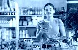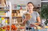 Grocery shopping at the supermarket - girl chooses sweets, nougat, cookies and candies