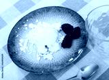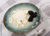 Rustic ceramic plate filled with cottage cheese topped with cream, served for breakfast alongside fresh blackberries on checkered tablecloth