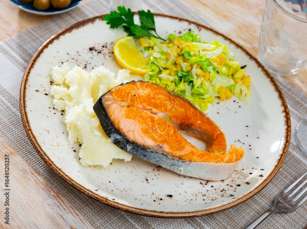 Salmon fillet served with potatoes and fresh vegetable salad on platter