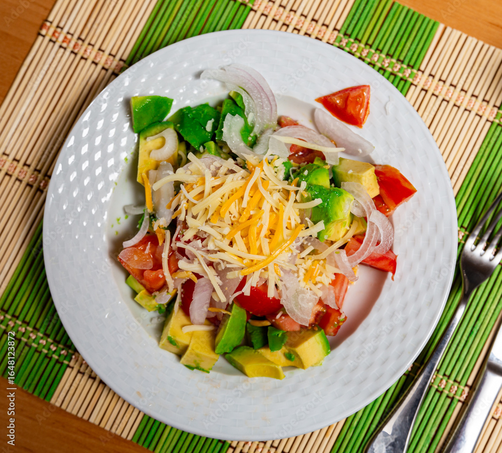 Tasty salad with avocado, tomatoes, cheese and onion is served on a plate