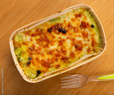 On wooden table traditional Italian dish is lasagna baked in oven under cheese crust