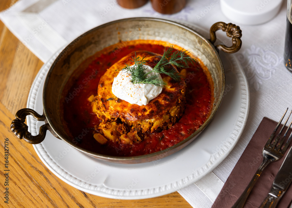 Eggplant with minced meat baked with cheese, moussaka dish in pot. Traditional eggplant dish in the Bulgaria