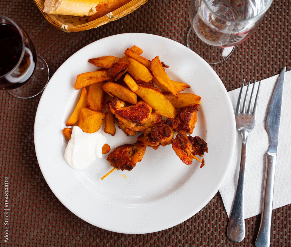 Delicious fried chicken kebab with potato pieces and sauce served on plate
