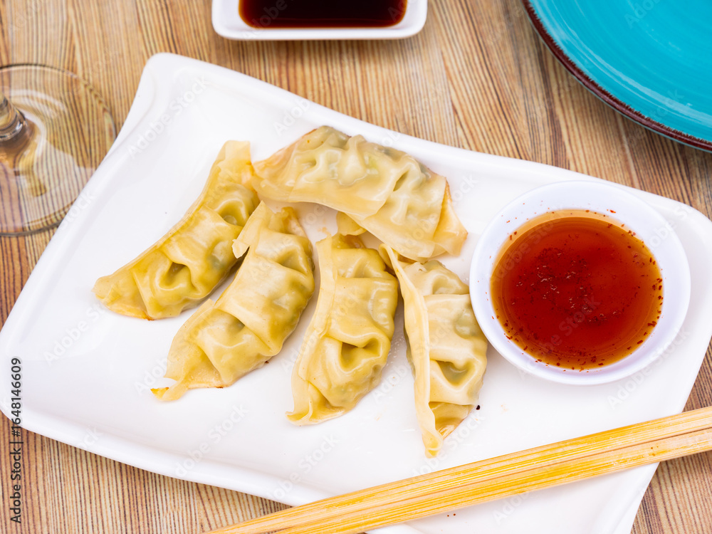 Appetizing steamed dumplings gyoza with soy dipping sauce. Traditional Japanese food..