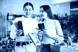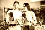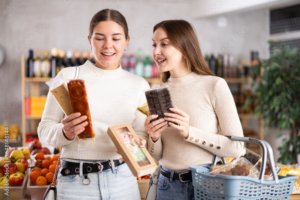 Joyful friends choose sweets, nut nougat and spanish turron. Two customers discuss the composition and calorie content of confectionery.