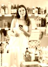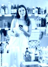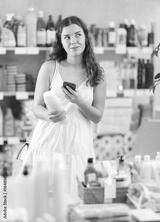 Interested young female customer looking through barcode details of shampoo while shopping in hot season