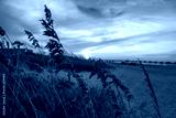Beautiful sunset over the beach with tall grass swaying gently in the breeze near the water