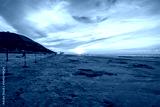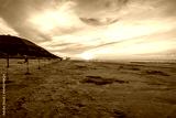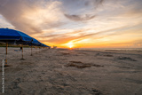 Colorful umbrellas line the sandy beach as the sun sets over the ocean horizon creating a serene evening atmosphere