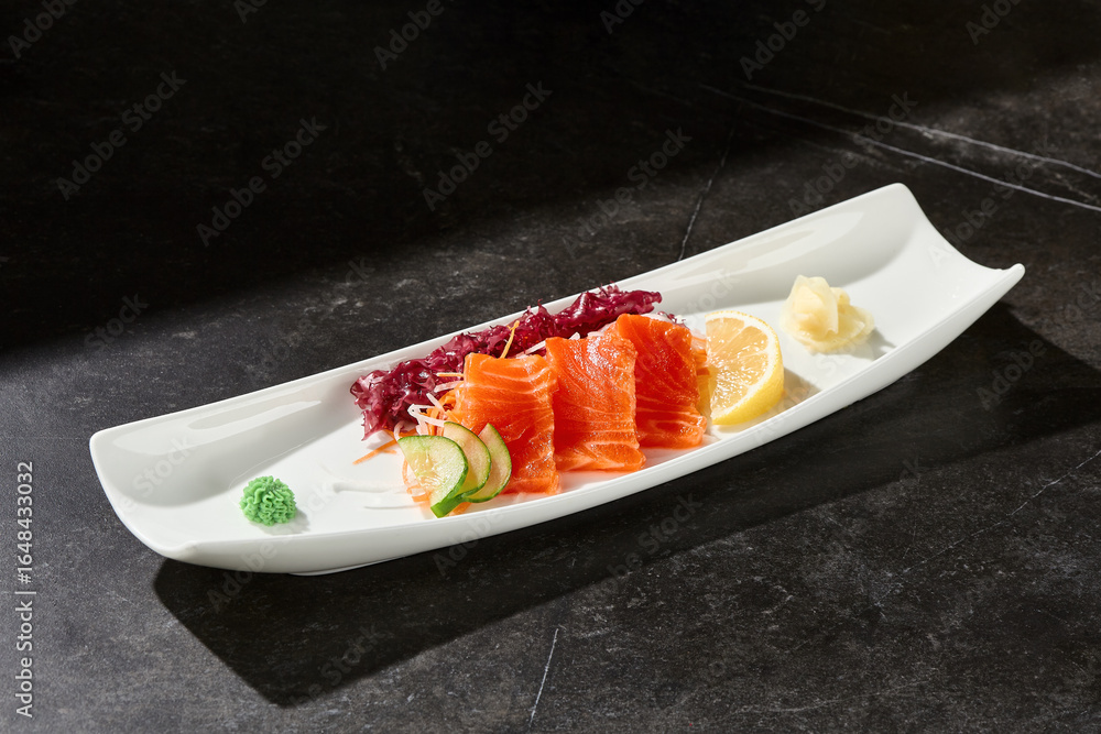 Salmon sashimi with cucumber and lemon, bright lighting, overhead composition