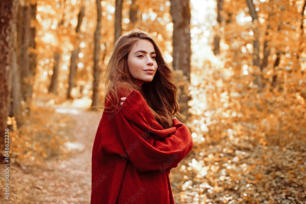 Carefree young woman in trendy vintage red pullover or sweater. Pretty woman walking in the Park and enjoying the beautiful autumn nature.