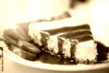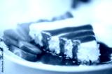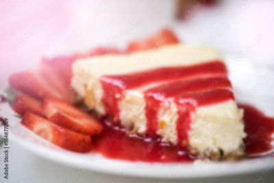 blurred image of Cheesecake with strawberry sauce on top with slices of strawberry for bakerries background