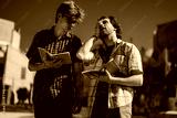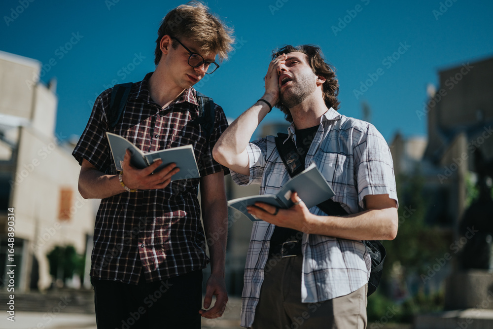 Two students are having a discussion, holding notebooks, under a bright and clear sky.