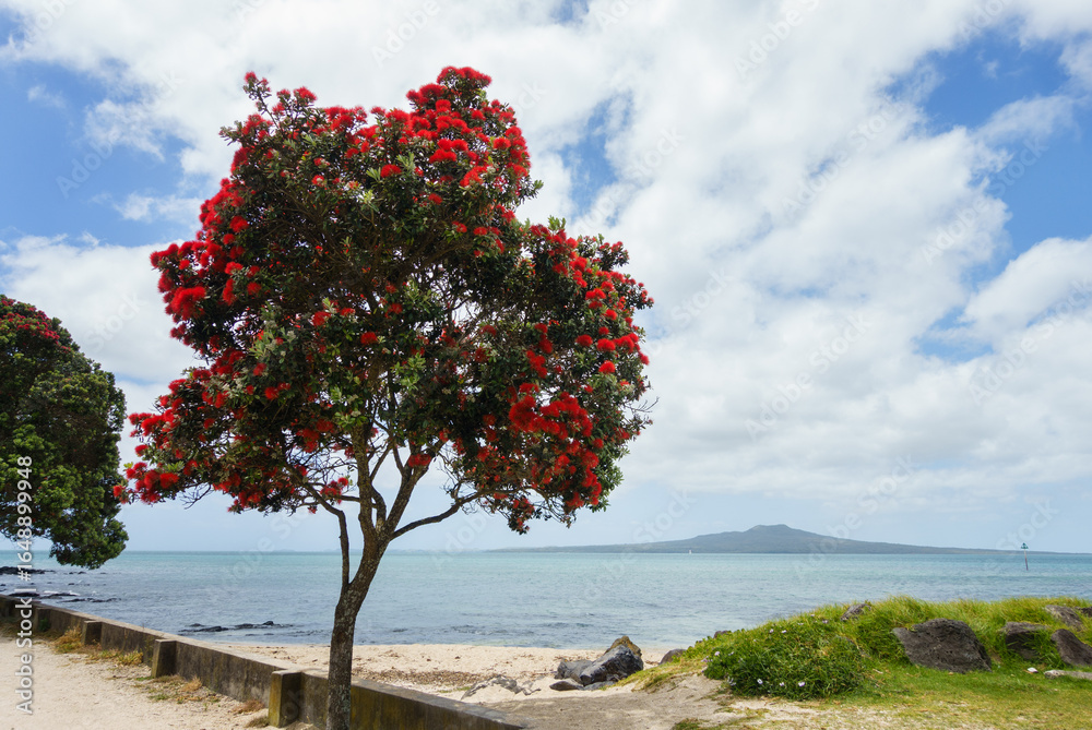 Pohutukawa trees in blooms in summer. Rangitoto Island in the distance. Takapuna Beach. Auckland.
