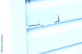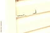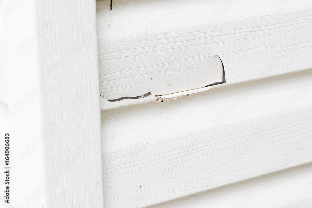 close up horizontal close up image of white plastic siding with a big crack in it.