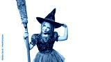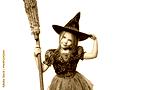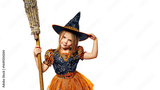 Happy child girl in witch with broom in costume, isolated on free png background. Halloween party time. Cute halloween poster.