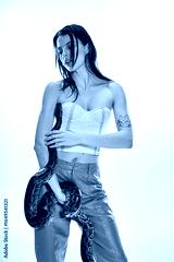 Young beautiful woman exudes confidence while posing with a snake in a modern studio setting