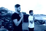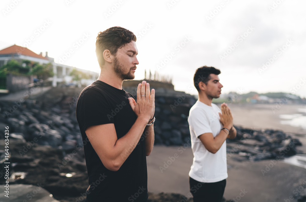 Two men in prayer pose by the sea, eyes closed, representing internal tech of stillness, masculine grounding and breath-centered presence in shared meditative state.