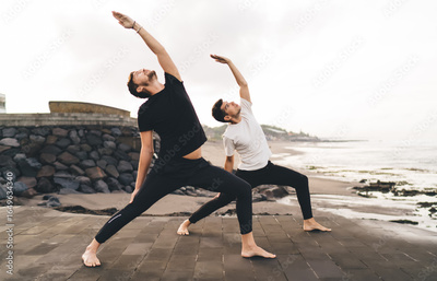 Two men perform reverse warrior pose in perfect sync, visualizing muscular geometry, breath-based presence and symmetrical body software executed with mindful command.