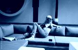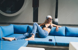 Trendy woman in sunglasses and bandana lounges with confidence, phone beside her, representing digital pause, screen break and intentional disconnection in tech-heavy life.
