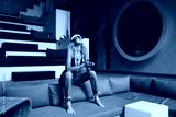 Minimalist indoor portrait of barefoot woman sitting casually, laughing with eyes closed, reflecting modern digital culture, joyful expression, freedom and self-confidence in mobile life.