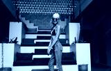 Stylish blonde woman in bikini and jeans turns to camera with confident smile, holding smartphone, standing in minimal interior with bright mood and digital-ready presence.
