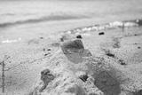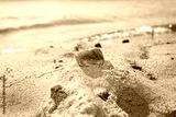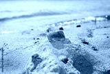Amber. A red piece of Baltic amber on a sandy beach against a background of sea waves. Natural mineral amber in the sand lit by the sun. Frozen resin as an ornament in jewelry production.