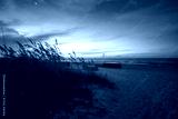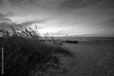 Sunset over quiet beach with gentle waves and tall grass under a colorful sky