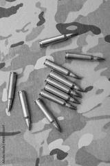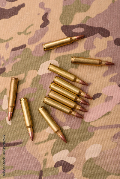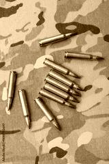 Machine gun cartridges on a camouflage background, military wallpaper. Camouflage background