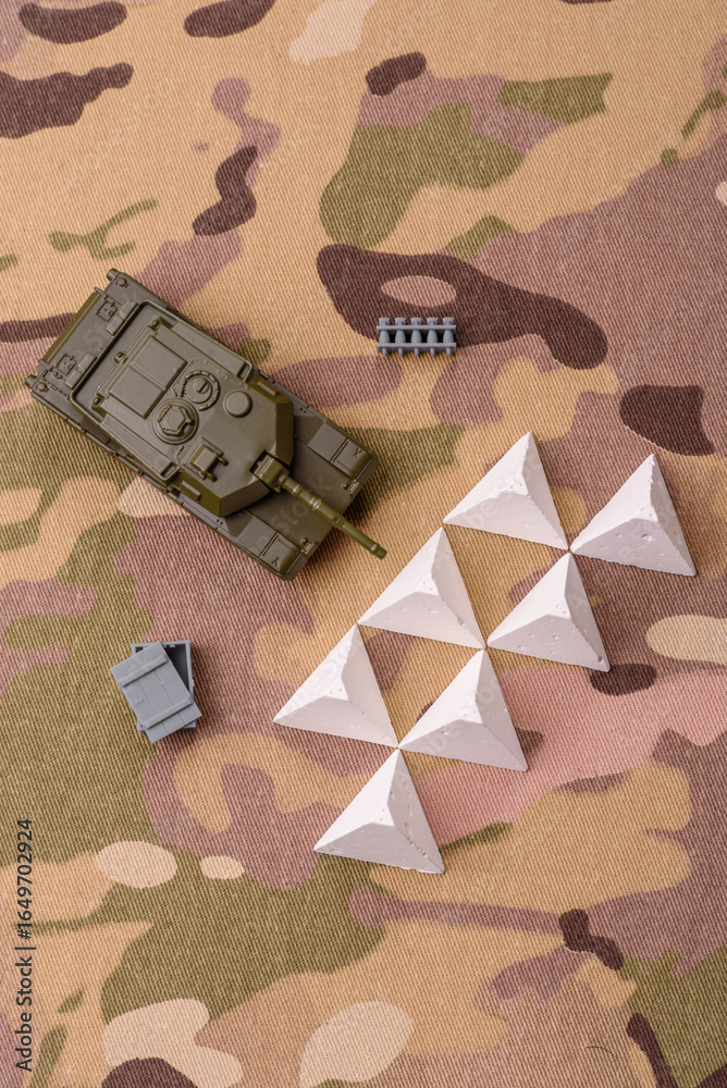 Anti-tank barrier or dragon's teeth made of concrete and iron as a fortification. Dragon's teeth