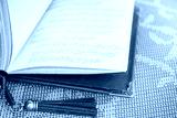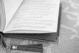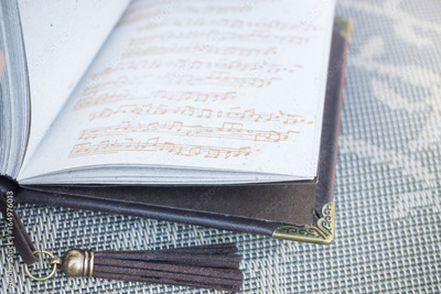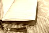 Brown leather handmade scrapbooking notebook for travellers scraps and memories, made as a gift, with tassel, corners and lace as decoration