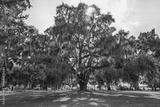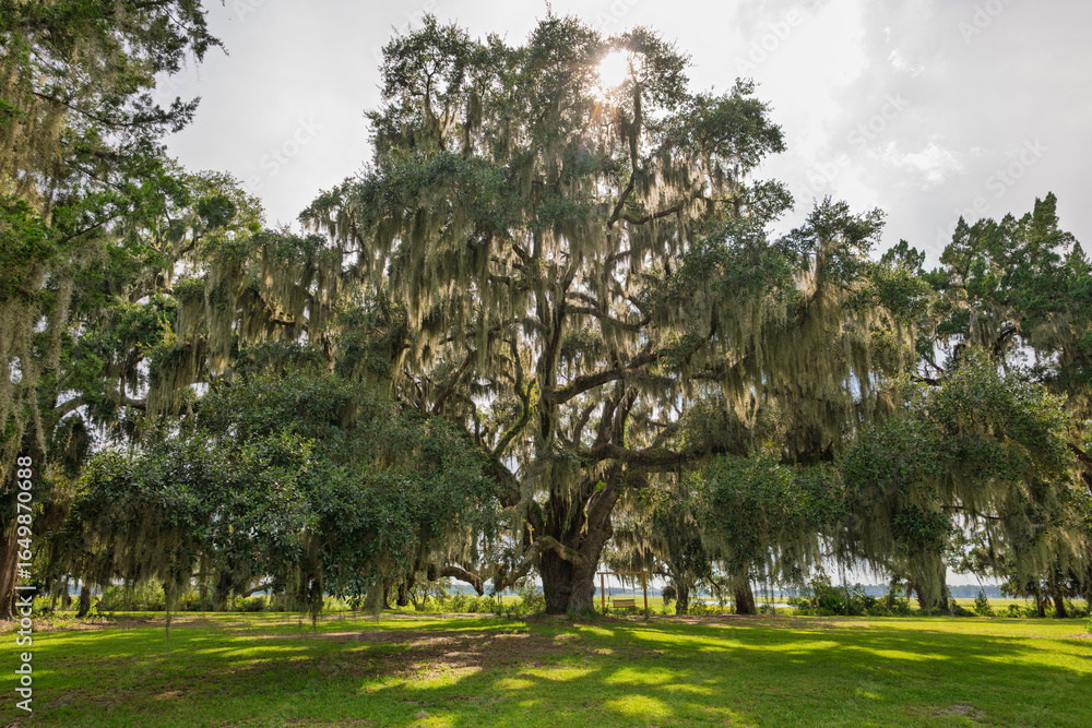 Majestic live oak tree with Spanish moss hanging elegantly under the blue sky in a tranquil park setting during daytime