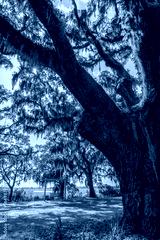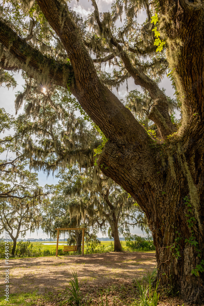 Majestic oak tree with moss near water in peaceful natural setting during sunny day