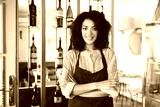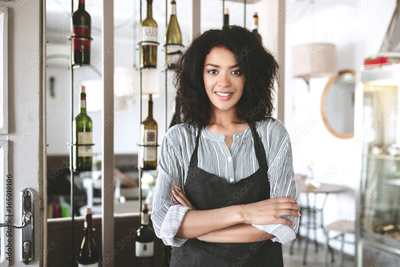 Beautiful African American girl in apron standing with arms folded in restaurant. Young girl with dark curly hair standing in apron at cafe. Portrait of smiling waitress wearing uniform