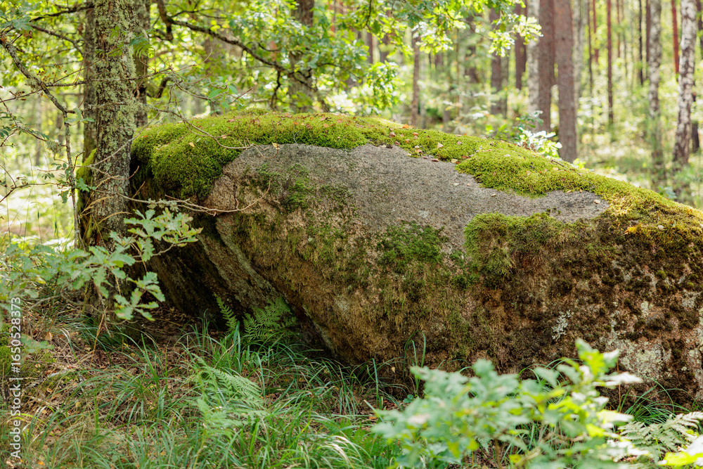 A large boulder brought by a glacier overgrown with moss lies in an oak forest