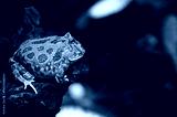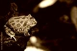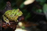 The green frog sitting in the shallow water