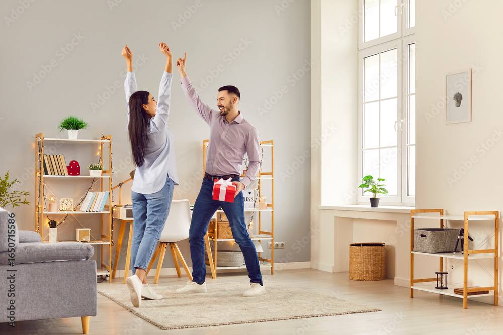 Young happy man and woman standing with present gift box in the living room at home. Smiling couple having fun indoors congratulating each other on holiday. Love and Valentines day concept.